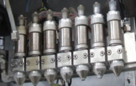サーボシステムを搭載したXYステージにより、マーキングノズルをキャラクターの形状に合わせて移動させながら、ノズルを開閉し一定距離移動するごとに塗料を吹き付けてマーキングする方式であるため、噴射時間間隔を狭めることができます 連続した行文字で、時間間隔を増やすとドット文字になります。